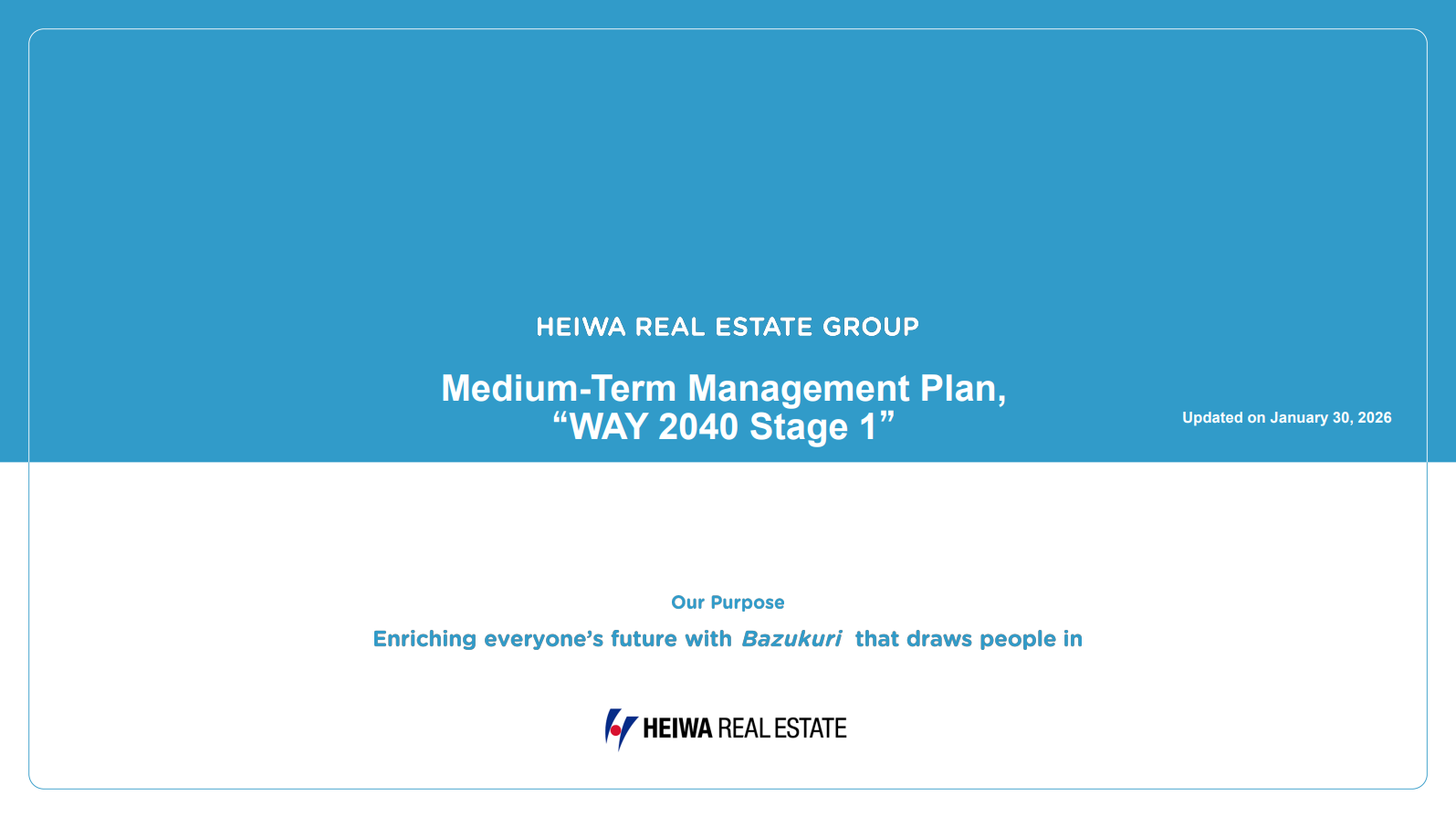 At the Board of Directors’ meeting held on March 29, 2024, a decision was made to formulate the Heiwa Real Estate Group Purpose, “Enriching everyone’s future with Bazukuri that draws people in,” and the Long-term Vision “WAY 2040” as roadmaps toward the future. In the new medium-term management plan, WAY 2040 Stage 1 (FY2024–FY2026), we have positioned this period as the initial sprint toward dynamic growth. This involves establishing the Nihonbashi Kabutocho and Kayabacho district brand, undertaking our largest-ever redevelopment projects, located in Sapporo, and venturing into new business domains to realize our vision, characterized by the slogan: Pursue perpetual dynamic growth to become the Bazukuri Company.