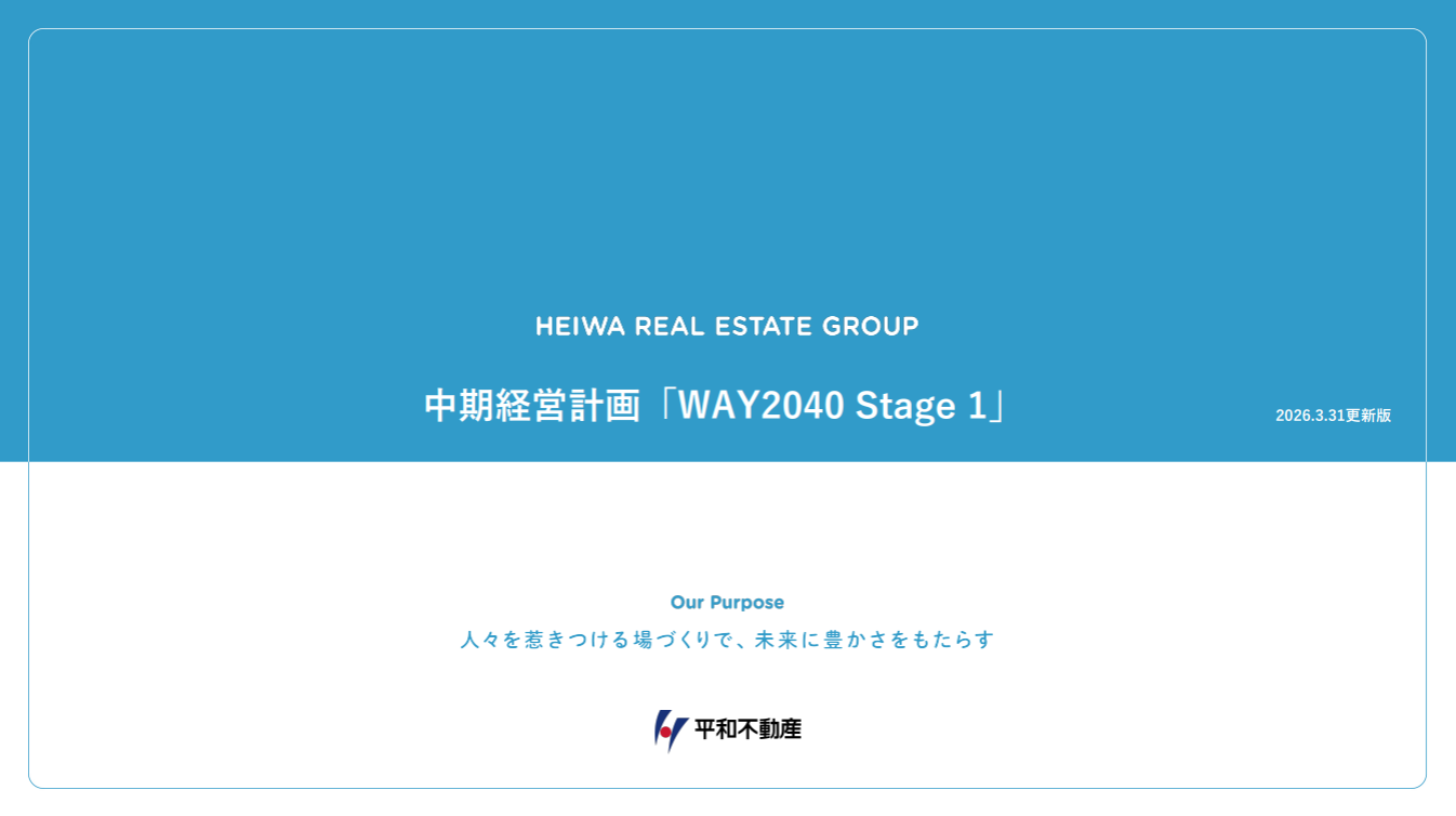 平和不動産グループとして長期的な目指すべきありたい姿を確立するため、2024年3月29日開催の当社取締役会において、平和不動産グループパーパス「人々を惹きつける場づくりで、未来に豊かさをもたらす」を制定し、平和不動産グループ長期ビジョン「WAY 2040」を策定するに至りました。中期経営計画「WAY 2040 Stage 1」(2024年度~2026年度)では、長期ビジョン「WAY 2040」のスローガンである「場づくりの連続で、非連続な成長を遂げる“Bazukuri Company”へ」のファーストステージとして、日本橋兜町・茅場町ブランドの確立、当社史上最大規模となる札幌再開発プロジェクトおよび長期ビジョンを実現するための新規事業分野への進出に挑戦することにより、「非連続な成長へのスタートダッシュ」の期間と位置付けます。